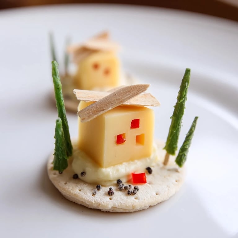 Save I discovered The Alpine Village at a holiday market in December, where a vendor had arranged these charming little cheese houses on crackers with such care that I couldn't resist buying a handful. The moment I bit into one, I realized how simple the magic was—crispy cracker, creamy cheese, and the delicate snap of an almond roof—but the playfulness of it stuck with me. That evening, I decided to recreate them for a dinner party, and watching my guests' faces light up when they realized these tiny architectural marvels were edible felt like pure joy. Now they've become my signature move whenever I need something festive but unfussy.