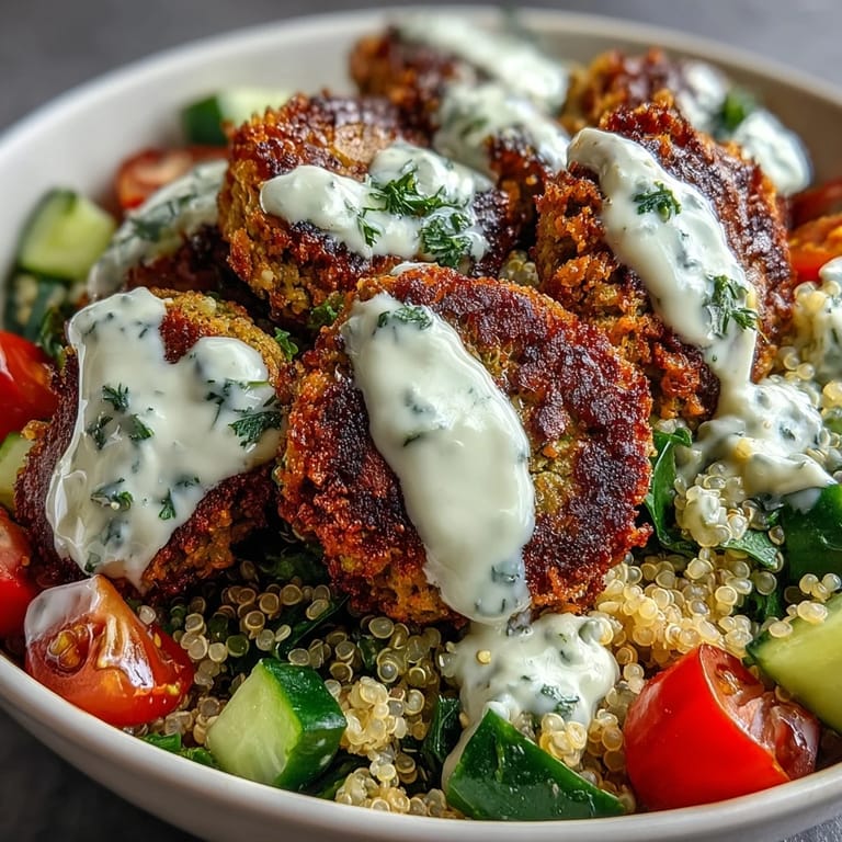 Save Experience a vibrant, wholesome meal with this Falafel Quinoa Salad Bowl. This Middle Eastern-inspired dish features crisp baked falafel served over a bed of fluffy quinoa, complemented by fresh cucumber, cherry tomatoes, and green onions. The entire bowl is brought together with a generous drizzle of creamy garlic tahini sauce, making it a satisfying choice for a nutritious lunch or dinner.