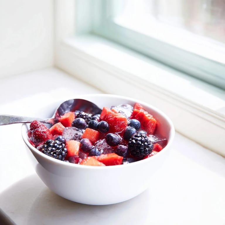 I made this for my partner on a Tuesday when the kitchen felt sticky and we both needed something that felt light. The way the ice cubes clinked against the sides of the bowls, the berries softening just slightly as they sat in the cold liquid—it became our unspoken agreement that breakfast didn't have to be complicated to be memorable.