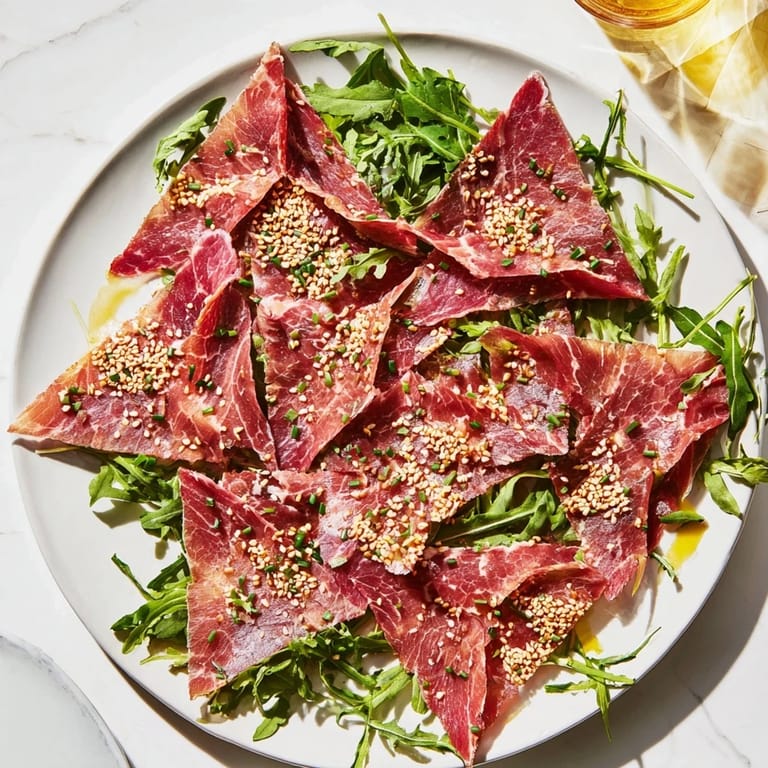 - Line your serving platter with the peppery arugula as your foundation, then nestle each folded beef piece into it like you're setting precious small sculptures. Leave enough space so each fold can be appreciated without crowding, and adjust as you go until it feels visually balanced.
